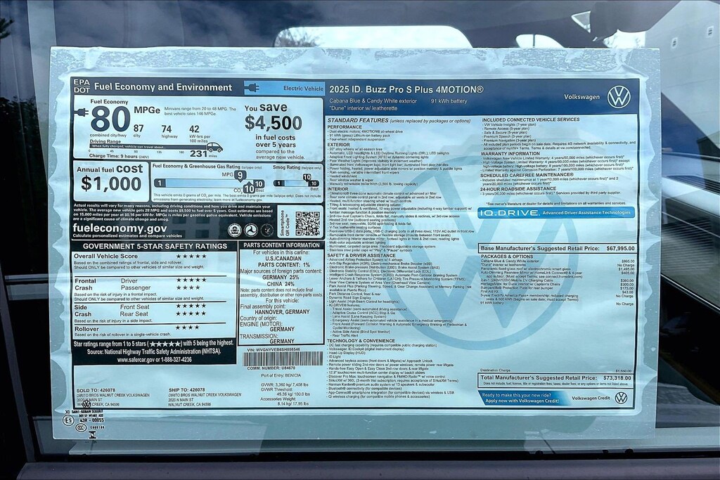 Pro S Plus 4Motion ID.Buzz Volkswagen 0 Miles 2025 $73,318 1-Speed Direct-Drive Automatic