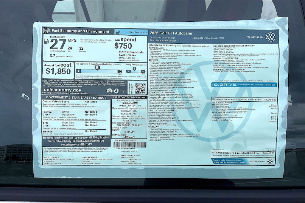 Autobahn Golf GTI Volkswagen 0 Miles 2026 $45,419 7-Speed Double Clutch