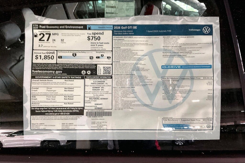 SE Golf GTI Volkswagen 0 Miles 2026 $43,319 7-Speed Double Clutch