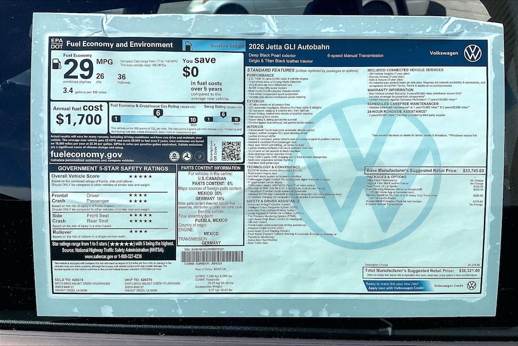 Autobahn Jetta GLI Volkswagen 0 Miles 2026 $36,321 6-Speed Manual