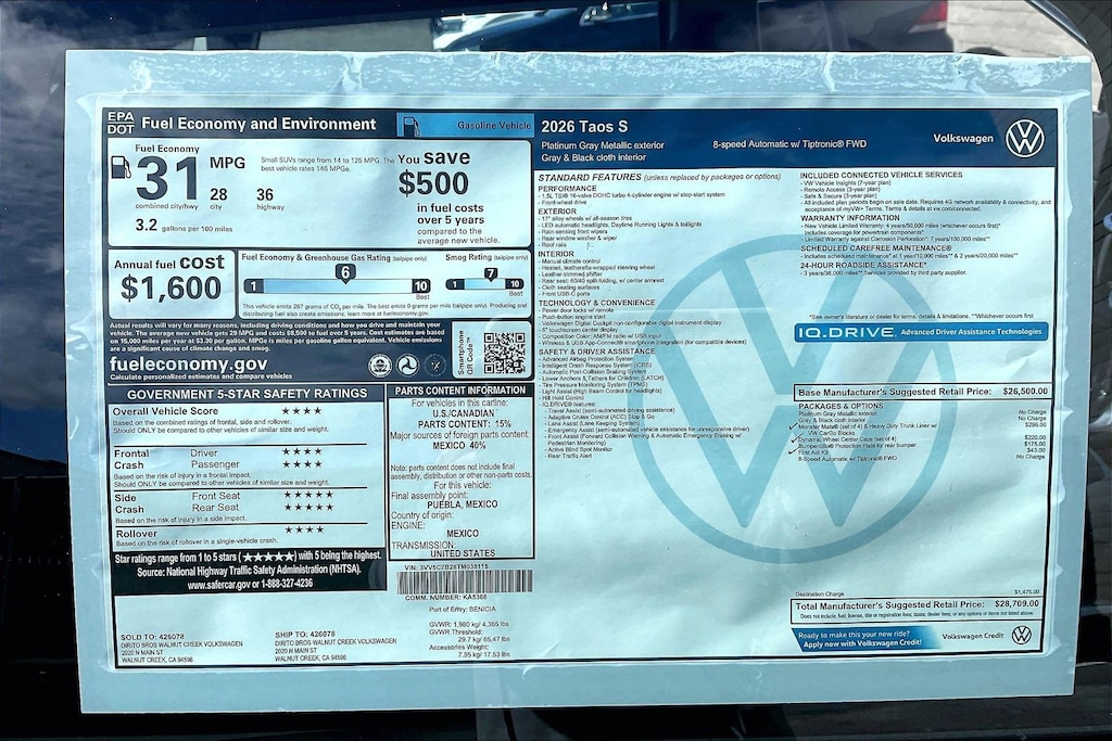 S Taos Volkswagen 0 Miles 2026 $28,709 8-Speed Shiftable Automatic