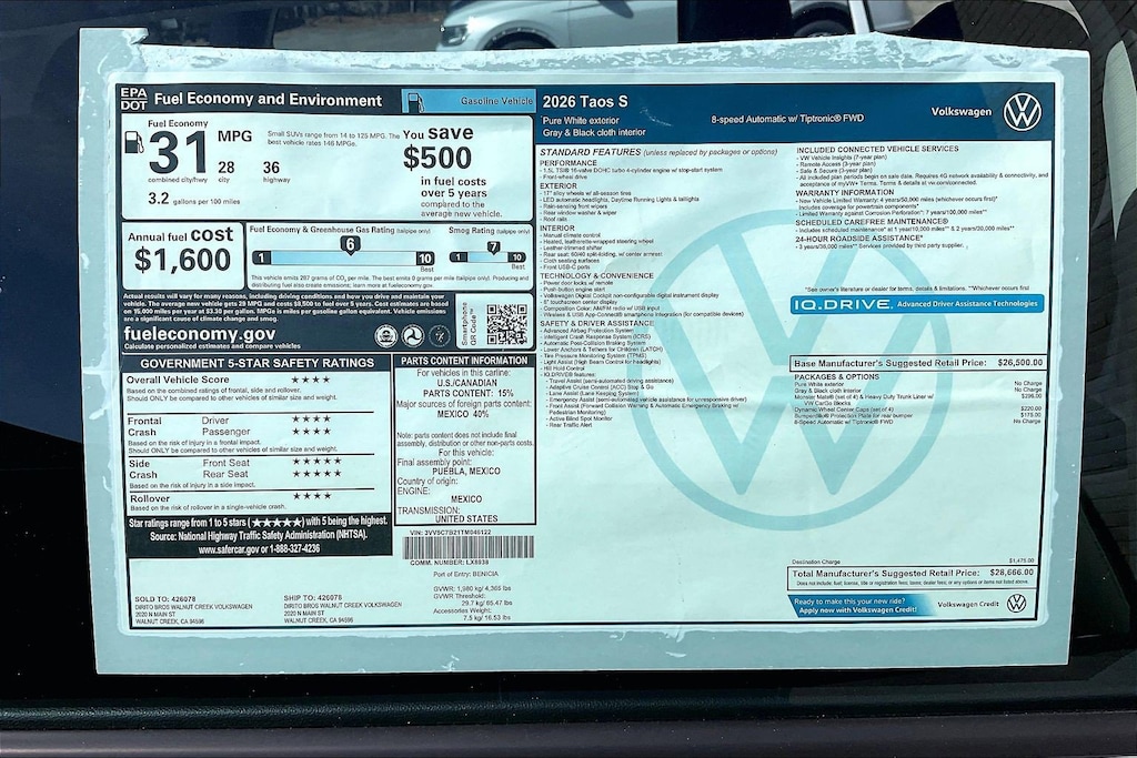 S Taos Volkswagen 0 Miles 2026 $28,666 8-Speed Shiftable Automatic
